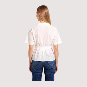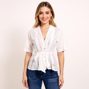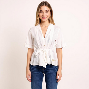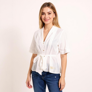 A white, semi-transparent blouse with short sleeves and a deep V-neckline. The blouse features a button-down front and is cinched at the waist with a fabric belt, creating a flattering and tailored silhouette. It is paired with dark blue jeans, offering a stylish yet casual look perfect for everyday wear. The combination of the crisp white blouse and classic denim makes this outfit versatile and effortlessly chic.