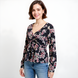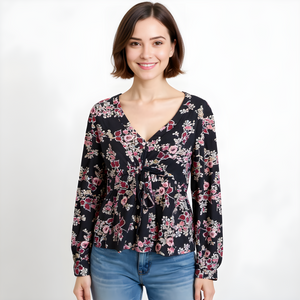 Bring a touch of elegance to your wardrobe with this Black and Cherry Peplum V-Neck Blouse. Designed with full sleeves and a flattering peplum silhouette, it perfectly balances sophistication with everyday comfort. The deep V-neckline adds a modern feminine edge, while the soft-finish fabric ensures a smooth, comfortable wear throughout the day.