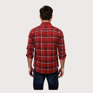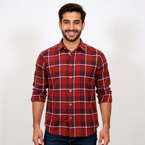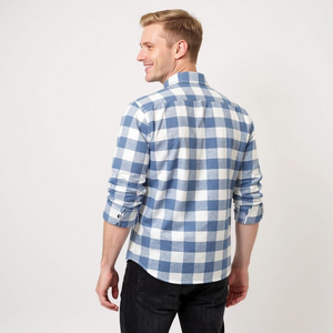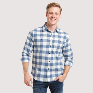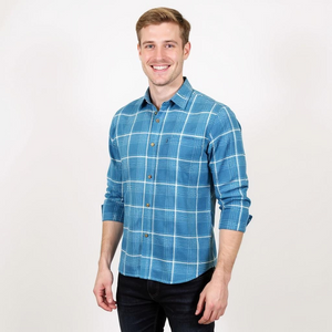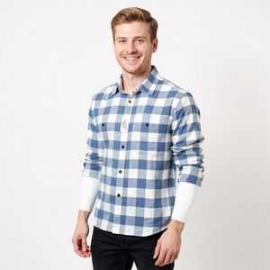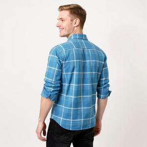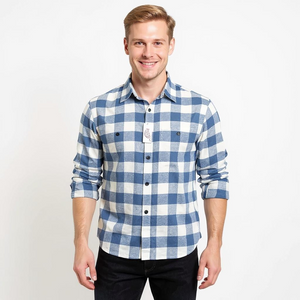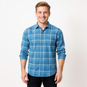 A blue, long-sleeved, button-up design with a white checkered pattern. It features a classic collar and brown buttons, adding a touch of contrast. The sleeves are slightly rolled up, giving it a relaxed, casual vibe. This versatile shirt is perfect for both casual and semi-casual occasions.