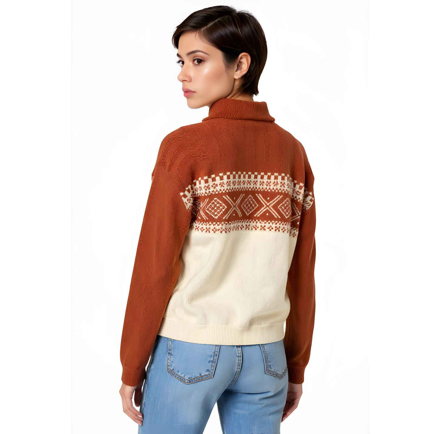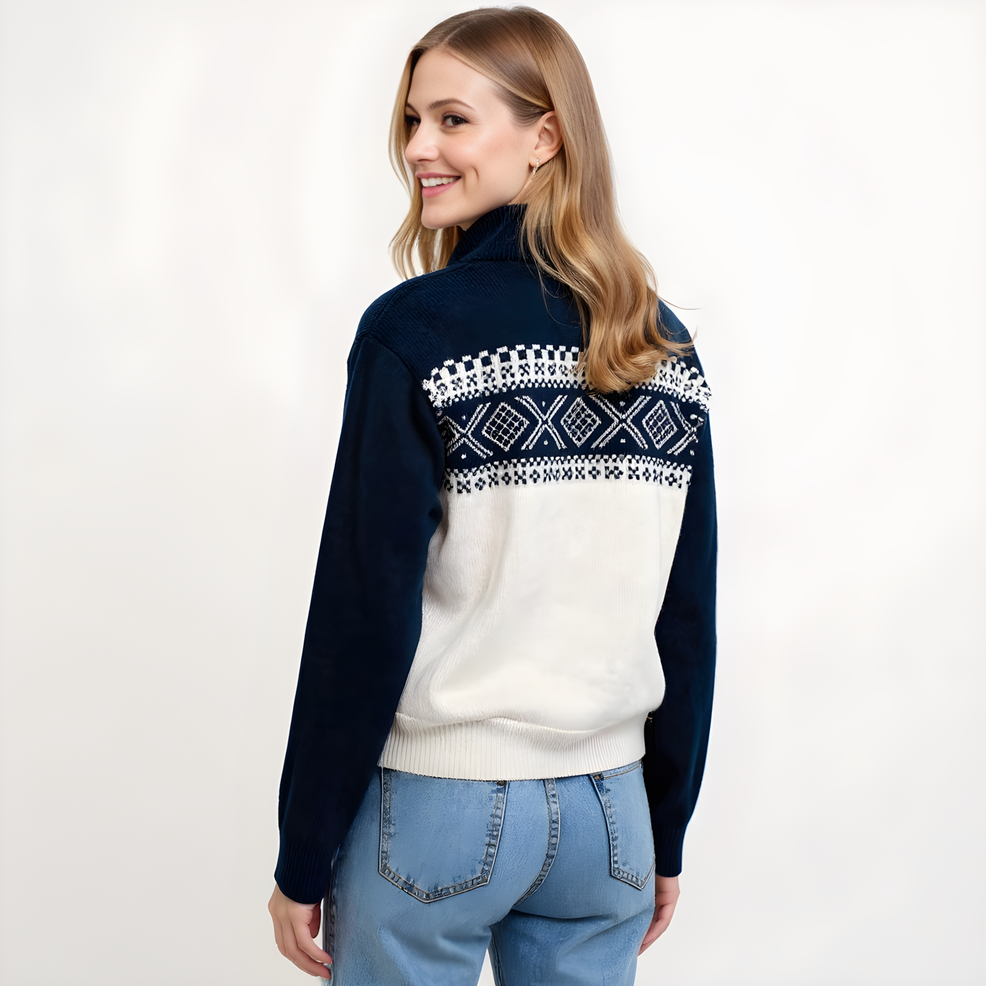 Stay warm and stylish with this Dark Blue Zip-Front High Neck Ski Sweater, featuring a striking jacquard design. Built for comfort in cold weather, it combines sporty function with timeless winter style. The high neck and front zipper provide adjustable warmth, while the soft knit fabric ensures all-day coziness on and off the slopes.