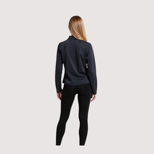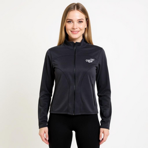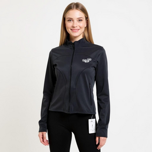 A sleek black jacket, zipped up to the top, showcasing a high collar and subtle stitching lines for a fitted, modern look. It prominently styled with a swoosh or orbit-like design, adding a futuristic and athletic vibe. The overall outfit exudes a minimalist and stylish appeal, perfect for those interested in modern activewear and minimalistic fashion.