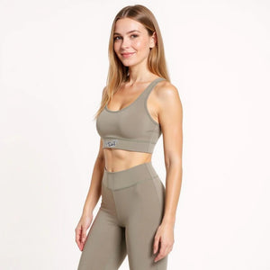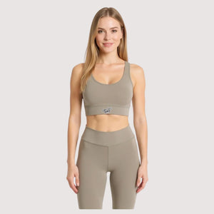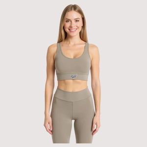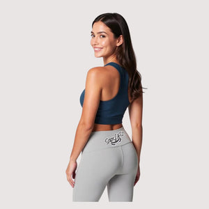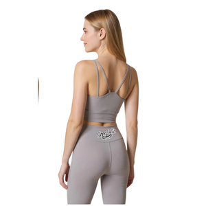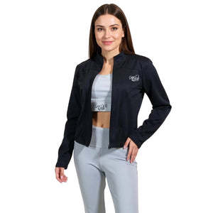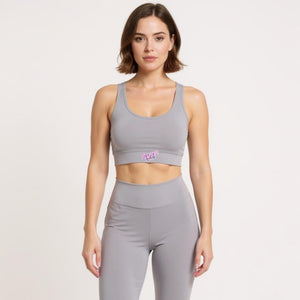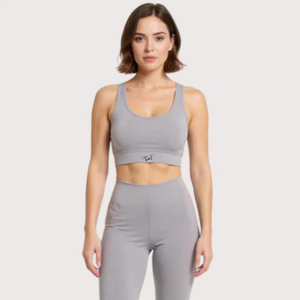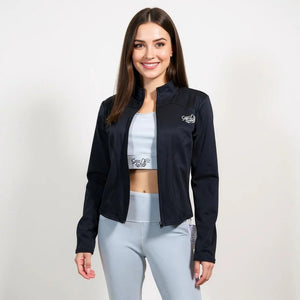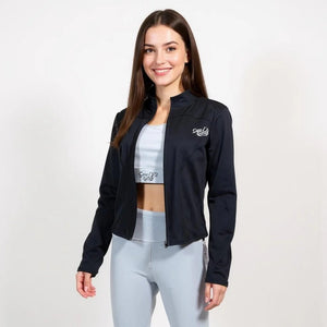 A stylish activewear set, including a black jacket, paired with a grey crop top and matching leggings. The jacket is worn open, showcasing the crop top beneath, creating a sporty and coordinated appearance. This outfit is perfect for fitness enthusiasts or those seeking a casual, athletic style.