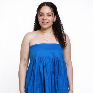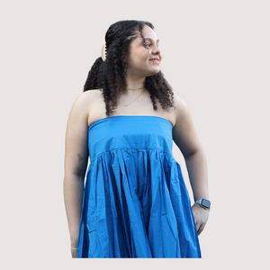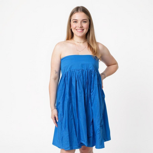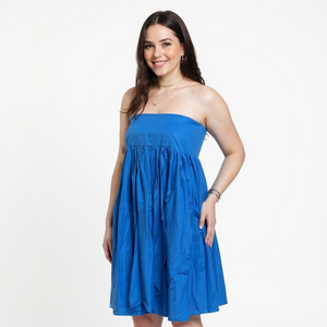 Make a statement in effortless style with this vibrant strapless blue midi dress. Featuring a flattering elasticized bodice and a voluminous, flowy skirt, this dress combines comfort with a carefree elegance. The lightweight fabric drapes beautifully, making it perfect for warm days, vacation getaways, or casual evening outings. Perfect For: Summer brunches, beach strolls, date nights, or dressing up with heels and jewelry.