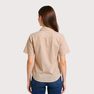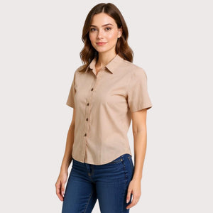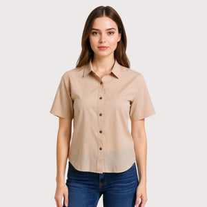 Women’s Short Sleeve Button-Down Shirt – Beige Keep it classic and versatile with this beige short sleeve button-down shirt. Designed with a structured collar and front button closure, this piece offers a clean, polished look perfect for both casual and professional settings. Crafted from lightweight, breathable fabric, it ensures comfort throughout the day while maintaining a sleek silhouette. Perfect For: Office wear, smart-casual outings, or weekend styling.
