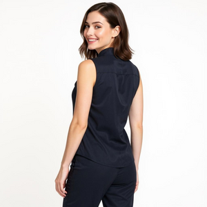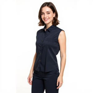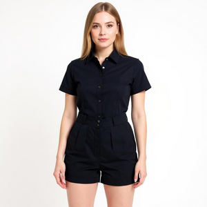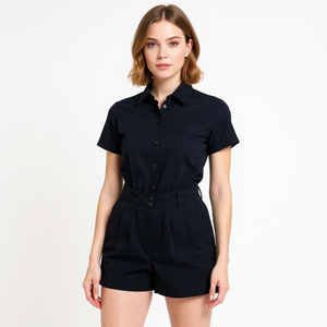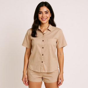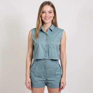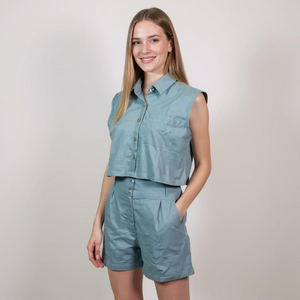 A matching set in a light teal color, perfect for casual or summer wear. It features a sleeveless button-up shirt with a collar and a chest pocket, paired with high-waisted shorts that have buttons and pleats at the front. The clean and simple design, combined with the soft teal shade, creates a fresh and stylish look ideal for warm weather.